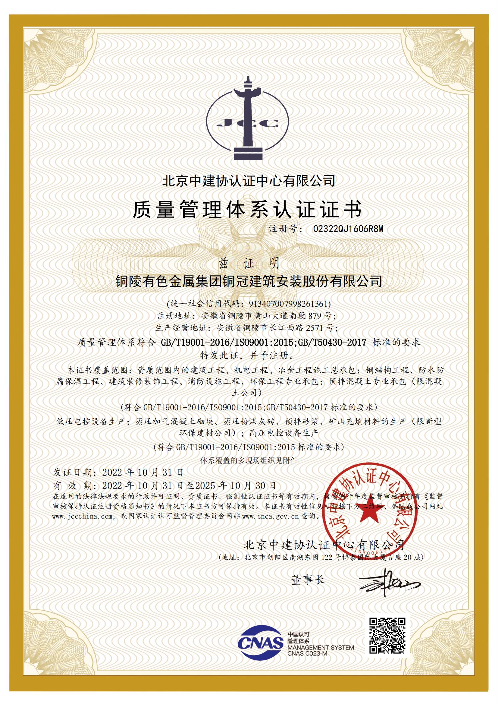 质量管理体系认证证书